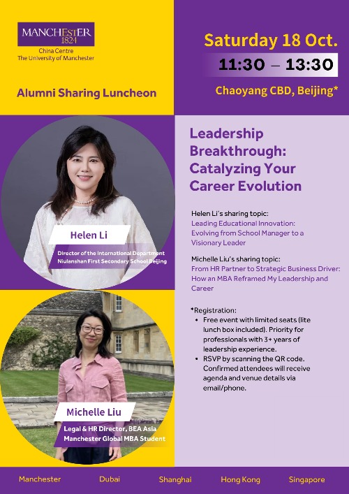 10月18日,曼彻斯特大学中国中心诚邀您参与北京校友午餐分享会,与我们一同探讨如何依靠领导力思维驱动职业进阶。