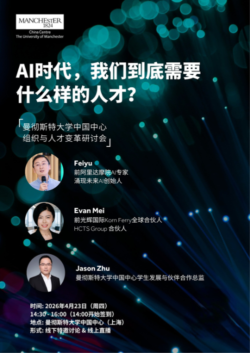 我们曾笃信各种胜任力模型与经验积累,但AI正在重新定义“专业能力”。未来,哪些能力会贬值?哪些素养将变得稀缺而昂贵?人类独特的提问力、批判性思维、跨领域迁移能力,以及与AI协同共创的“融合智能”,将如何重塑组织的人才筛选标准? 2026年4月23日(周四)下午,曼彻斯特大学中国中心将举办AI驱动的组织与人才变革研讨会。我们特邀曾在世界顶尖组织咨询公司光辉国际担任全球合伙人和阿里达摩院任职AI专家两位重量级嘉宾亲临现场,以自身跨越大企业周期、完成职业升级的实践经验,深度剖析当下组织和人才的变革之道。 本次研讨会不提供标准答案,而是邀请跨界思考者、企业实践者与创新者,共同拆解一个既紧迫又深刻的问题:在算法与人性交织的新坐标系下,我们究竟该成为什么样的人才? 分享亮点 行业嘉宾:聆听来自人工智能、组织咨询领域的实战派大咖,解析企业、创业型组织对于人才的需求变化。 直面变革:主题聚焦当下现状——在企业结构调整及AI带来的冲击下,我们应该如何未雨绸缪,培养明天所需要的能力? 曼大赋能:深入了解曼彻斯特大学全球在职MBA如何通过“原创思维,学以致用”的教学理念,助力职场精英突破职业瓶颈,获得国际视野与高阶管理智慧。 议程安排: 14:00 – 14:30 现场签到 & 会前交流 14:30 – 14:40 曼彻斯特大学及中国中心介绍 14:40 – 15:00 曼大全球在职MBA项目深度解读 15:00 – 15:45 组织与变革研讨会及互动讨论 15:45 – 16:00 提问与回答
